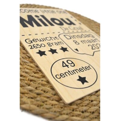 Dit originele houten geboortebord is super leuk om de kinderkamer mee te decoreren. Door het gebruik van een zachte houtsoort heeft het geboorte bord een rustige uitstraling en past het overal mooi bij! Het geboortebord is van hout (hand) gemaakt