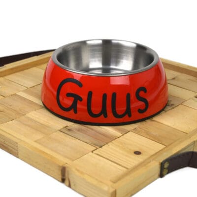 • rode voerbak met eigen naam met rvs bakje
